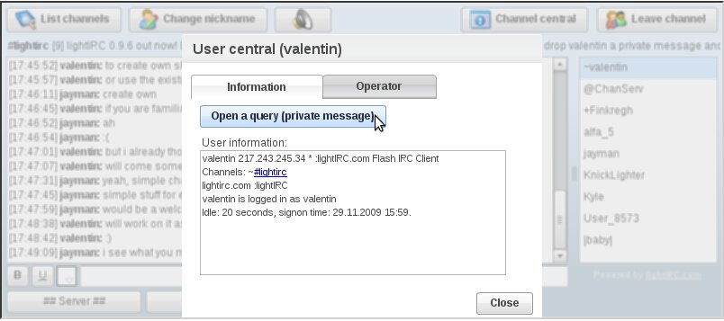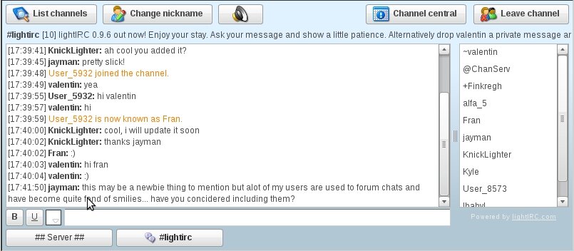 lightIRC, the “fast, free, flash-based IRC client written in ActionScript 3″ just released version 0.9.6 of their embeddable webchat.