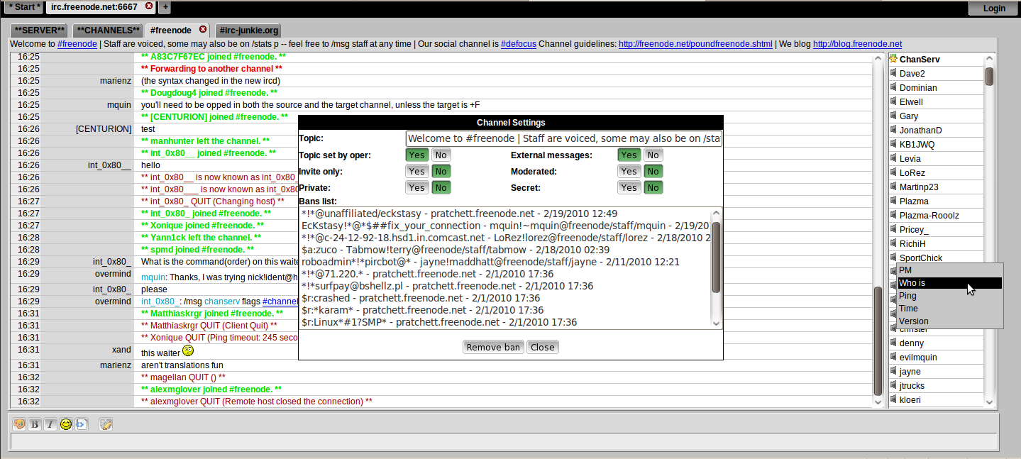 As you can see from the screenshot, the most important functions are already there: right-click menus for miscellaneous functions such as /WHOIS or /PRIVMSG’ing users, a Channel-Central to handle the most basic modes and bans. Registering your nick or channel through a simple popup is implemented and the usual buttons for smileys, font-color and style are available too.